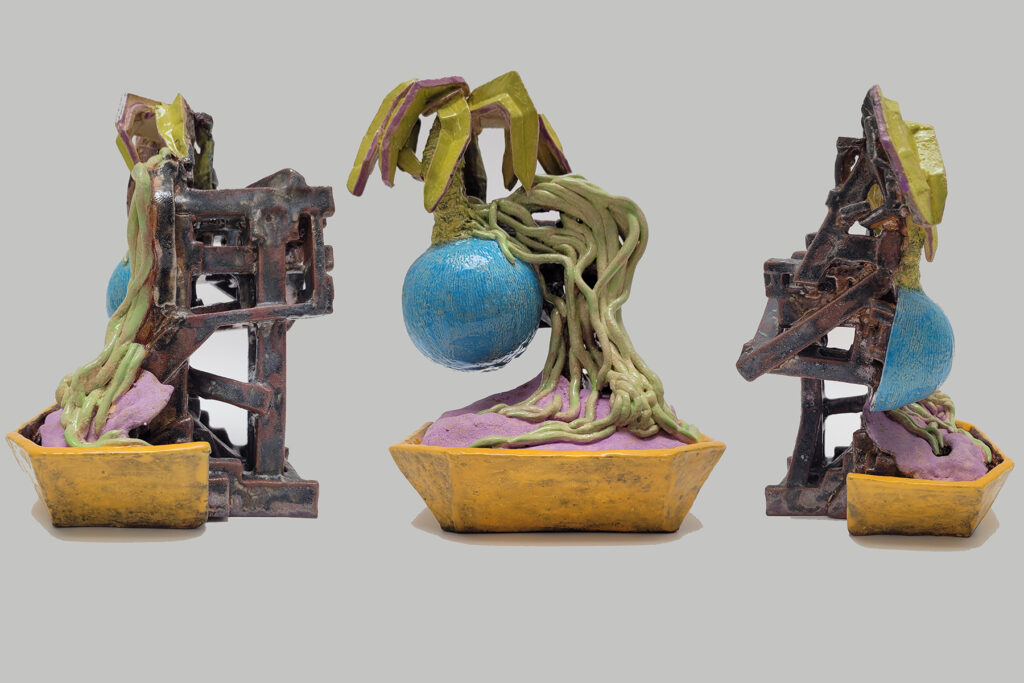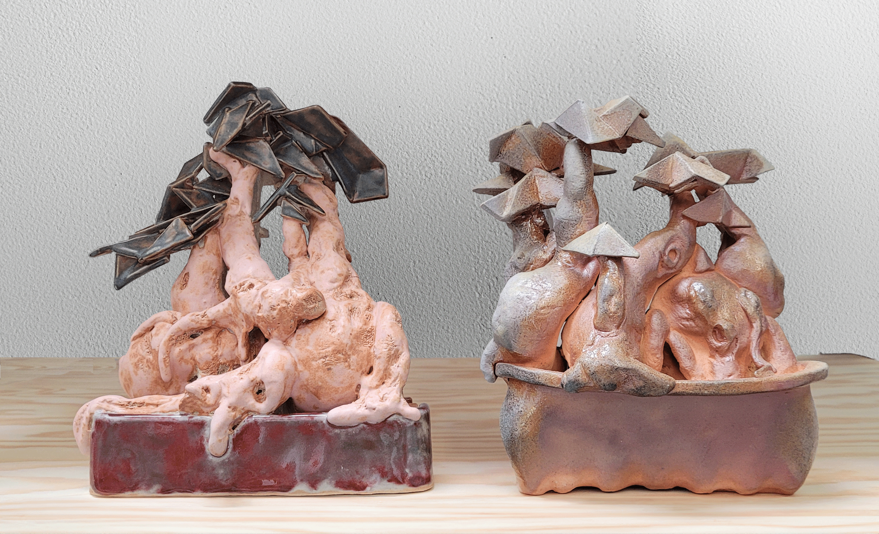 Two red, blue, and lavender glazed ceramic pieces on turntables, turned to reveal front and rear three-quarters' views. One features a tree root system partially covering the carving of a face, the other reveals a scaffolding-like structure on the back of a tree trunk growing out of a tiled sidewalk.